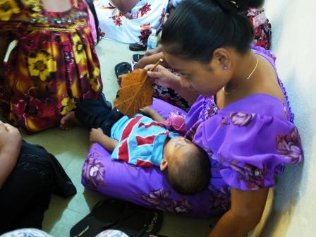 パンの木の葉っぱをうちわ代わりにする若いママ。